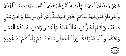 185. Shahru ramadana allathee onzila feehi alqur-anu hudan lilnnasi wabayyinatin mina alhuda waalfurqani faman shahida minkumu alshshahra falyasumhu waman kana mareedan aw AAala safarin faAAiddatun min ayyamin okhara yureedu Allahu bikumu alyusra wala yureedu bikumu alAAusra walitukmiloo alAAiddata walitukabbiroo Allaha AAala ma hadakum walaAAallakum tashkuroona
