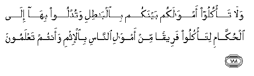 188. Wala ta/kuloo amwalakum baynakum bialbatili watudloo biha ila alhukkami lita/kuloo fareeqan min amwali alnnasi bial-ithmi waantum taAAlamoona