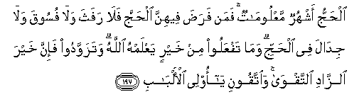 197. Alhajju ashhurun maAAloomatun faman farada feehinna alhajja fala rafatha wala fusooqa wala jidala fee alhajji wama tafAAaloo min khayrin yaAAlamhu Allahu watazawwadoo fa-inna khayra alzzadi alttaqwa waittaqooni ya olee al-albabi