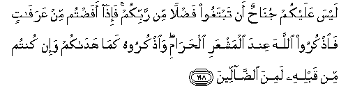 198. Laysa AAalaykum junahun an tabtaghoo fadlan min rabbikum fa-itha afadtum min AAarafatin faothkuroo Allaha AAinda almashAAari alharami waothkuroohu kama hadakum wa-in kuntum min qablihi lamina alddalleena