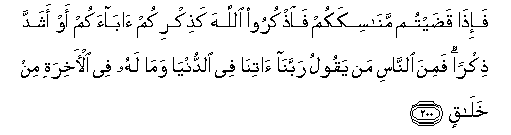 200. Fa-itha qadaytum manasikakum faothkuroo Allaha kathikrikum abaakum aw ashadda thikran famina alnnasi man yaqoolu rabbana atina fee alddunya wama lahu fee al-akhirati min khalaqin