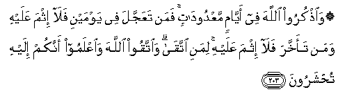 203. Waothkuroo Allaha fee ayyamin maAAdoodatin faman taAAajjala fee yawmayni fala ithma AAalayhi waman taakhkhara fala ithma AAalayhi limani ittaqa waittaqoo Allaha waiAAlamoo annakum ilayhi tuhsharoona