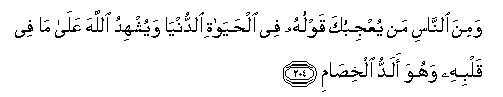 204. Wamina alnnasi man yuAAjibuka qawluhu fee alhayati alddunya wayushhidu Allaha AAala ma fee qalbihi wahuwa aladdu alkhisami