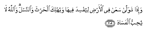 205. Wa-itha tawalla saAAa fee al-ardi liyufsida feeha wayuhlika alhartha waalnnasla waAllahu la yuhibbu alfasada