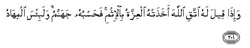 206. Wa-itha qeela lahu ittaqi Allaha akhathat-hu alAAizzatu bial-ithmi fahasbuhu jahannamu walabi/sa almihadu