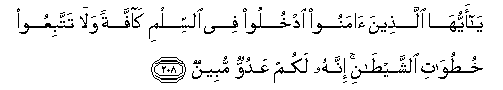 208. Ya ayyuha allatheena amanoo odkhuloo fee alssilmi kaffatan wala tattabiAAoo khutuwati alshshaytani innahu lakum AAaduwwun mubeenun