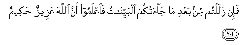 209. Fa-in zalaltum min baAAdi ma jaatkumu albayyinatu faiAAlamoo anna Allaha AAazeezun hakeemun