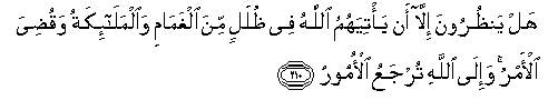 210. Hal yanthuroona illa an ya/tiyahumu Allahu fee thulalin mina alghamami waalmala-ikatu waqudiya al-amru wa-ila Allahi turjaAAu al-omooru