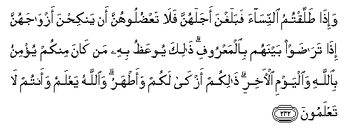 232. Wa-itha tallaqtumu alnnisaa fabalaghna ajalahunna fala taAAduloohunna an yankihna azwajahunna itha taradaw baynahum bialmaAAroofi thalika yooAAathu bihi man kana minkum yu/minu biAllahi waalyawmi al-akhiri thalikum azka lakum waatharu waAllahu yaAAlamu waantum la taAAlamoona