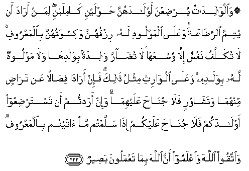233. Waalwalidatu yurdiAAna awladahunna hawlayni kamilayni liman arada an yutimma alrradaAAata waAAala almawloodi lahu rizquhunna wakiswatuhunna bialmaAAroofi la tukallafu nafsun illa wusAAaha la tudarra walidatun biwaladiha wala mawloodun lahu biwaladihi waAAala alwarithi mithlu thalika fa-in arada fisalan AAan taradin minhuma watashawurin fala junaha AAalayhima wa-in aradtum an tastardiAAoo awladakum fala junaha AAalaykum itha sallamtum ma ataytum bialmaAAroofi waittaqoo Allaha waiAAlamoo anna Allaha bima taAAmaloona baseerun