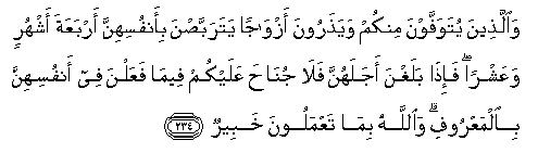 234. Waallatheena yutawaffawna minkum wayatharoona azwajan yatarabbasna bi-anfusihinna arbaAAata ashhurin waAAashran fa-itha balaghna ajalahunna fala junaha AAalaykum feema faAAalna fee anfusihinna bialmaAAroofi waAllahu bima taAAmaloona khabeerun