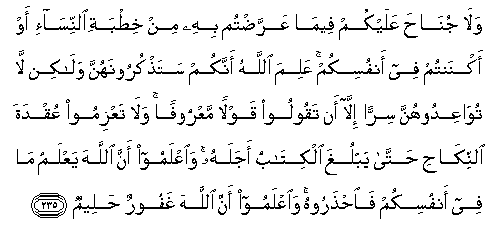 235. Wala junaha AAalaykum feema AAarradtum bihi min khitbati alnnisa-i aw aknantum fee anfusikum AAalima Allahu annakum satathkuroonahunna walakin la tuwaAAidoohunna sirran illa an taqooloo qawlan maAAroofan wala taAAzimoo AAuqdata alnnikahi hatta yablugha alkitabu ajalahu waiAAlamoo anna Allaha yaAAlamu ma fee anfusikum faihtharoohu waiAAlamoo anna Allaha ghafoorun haleemun