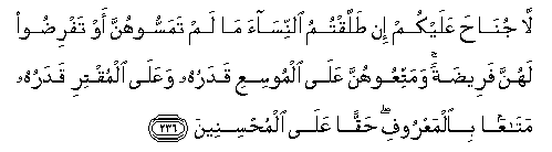 236. La junaha AAalaykum in tallaqtumu alnnisaa ma lam tamassoohunna aw tafridoo lahunna fareedatan wamattiAAoohunna AAala almoosiAAi qadaruhu waAAala almuqtiri qadaruhu mataAAan bialmaAAroofi haqqan AAala almuhsineena