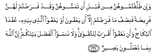 237. Wa-in tallaqtumoohunna min qabli an tamassoohunna waqad faradtum lahunna fareedatan fanisfu ma faradtum illa an yaAAfoona aw yaAAfuwa allathee biyadihi AAuqdatu alnnikahi waan taAAfoo aqrabu lilttaqwa wala tansawoo alfadla baynakum inna Allaha bima taAAmaloona baseerun