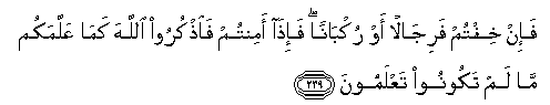 239. Fa-in khiftum farijalan aw rukbanan fa-itha amintum faothkuroo Allaha kama AAallamakum ma lam takoonoo taAAlamoona