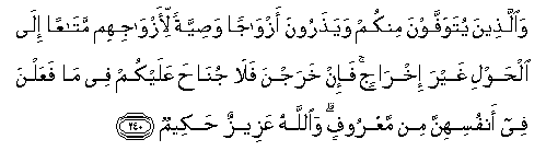240. Waallatheena yutawaffawna minkum wayatharoona azwajan wasiyyatan li-azwajihim mataAAan ila alhawli ghayra ikhrajin fa-in kharajna fala junaha AAalaykum fee ma faAAalna fee anfusihinna min maAAroofin waAllahu AAazeezun hakeemun