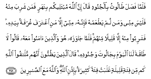 249. Falamma fasala talootu bialjunoodi qala inna Allaha mubtaleekum binaharin faman shariba minhu falaysa minnee waman lam yatAAamhu fa-innahu minnee illa mani ightarafa ghurfatan biyadihi fashariboo minhu illa qaleelan minhum falamma jawazahu huwa waallatheena amanoo maAAahu qaloo la taqata lana alyawma bijaloota wajunoodihi qala allatheena yathunnoona annahum mulaqoo Allahi kam min fi-atin qaleelatin ghalabat fi-atan katheeratan bi-ithni Allahi waAllahu maAAa alssabireena
