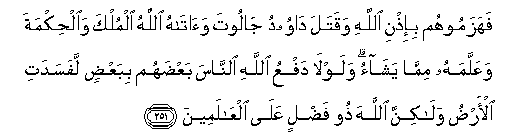 251. Fahazamoohum bi-ithni Allahi waqatala dawoodu jaloota waatahu Allahu almulka waalhikmata waAAallamahu mimma yashao walawla dafAAu Allahi alnnasa baAAdahum bibaAAdin lafasadati al-ardu walakinna Allaha thoo fadlin AAala alAAalameena