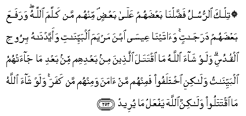 253. Tilka alrrusulu faddalna baAAdahum AAala baAAdin minhum man kallama Allahu warafaAAa baAAdahum darajatin waatayna AAeesa ibna maryama albayyinati waayyadnahu biroohi alqudusi walaw shaa Allahu ma iqtatala allatheena min baAAdihim min baAAdi ma jaat-humu albayyinatu walakini ikhtalafoo faminhum man amana waminhum man kafara walaw shaa Allahu ma iqtataloo walakinna Allaha yafAAalu ma yureedu