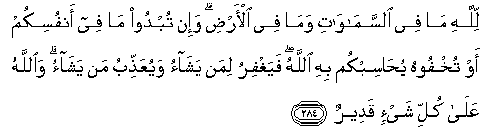 284. Lillahi ma fee alssamawati wama fee al-ardi wa-in tubdoo ma fee anfusikum aw tukhfoohu yuhasibkum bihi Allahu fayaghfiru liman yashao wayuAAaththibu man yashao waAllahu AAala kulli shay-in qadeerun