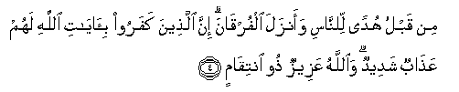 4. Min qablu hudan lilnnasi waanzala alfurqana inna allatheena kafaroo bi-ayati Allahi lahum AAathabun shadeedun waAllahu AAazeezun thoo intiqamin