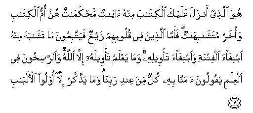 7. Huwa allathee anzala AAalayka alkitaba minhu ayatun muhkamatun hunna ommu alkitabi waokharu mutashabihatun faamma allatheena fee quloobihim zayghun fayattabiAAoona ma tashabaha minhu ibtighaa alfitnati waibtighaa ta/weelihi wama yaAAlamu ta/weelahu illa Allahu waalrrasikhoona fee alAAilmi yaqooloona amanna bihi kullun min AAindi rabbina wama yaththakkaru illa oloo al-albabi