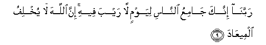 9. Rabbana innaka jamiAAu alnnasi liyawmin la rayba feehi inna Allaha la yukhlifu almeeAAada