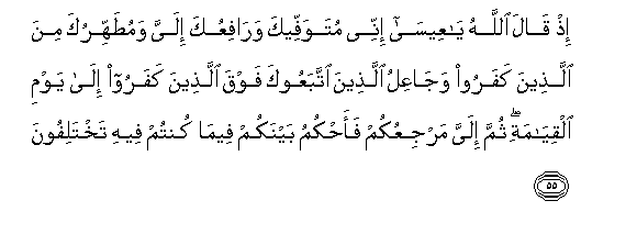 55. Ith qala Allahu ya AAeesa innee mutawaffeeka warafiAAuka ilayya wamutahhiruka mina allatheena kafaroo wajaAAilu allatheena ittabaAAooka fawqa allatheena kafaroo ila yawmi alqiyamati thumma ilayya marjiAAukum faahkumu baynakum feema kuntum feehi takhtalifoona