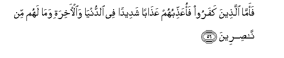 56. Faamma allatheena kafaroo faoAAaththibuhum AAathaban shadeedan fee alddunya waal-akhirati wama lahum min nasireena