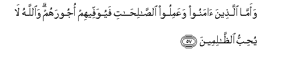 57. Waamma allatheena amanoo waAAamiloo alssalihati fayuwaffeehim ojoorahum waAllahu la yuhibbu alththalimeena