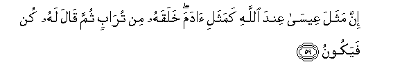 59. Inna mathala AAeesa AAinda Allahi kamathali adama khalaqahu min turabin thumma qala lahu kun fayakoonu