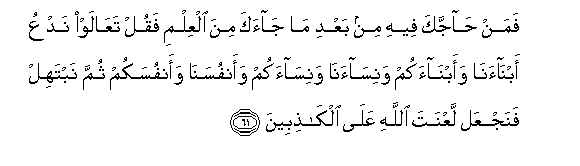 61. Faman hajjaka feehi min baAAdi ma jaaka mina alAAilmi faqul taAAalaw nadAAu abnaana waabnaakum wanisaana wanisaakum waanfusana waanfusakum thumma nabtahil fanajAAal laAAnata Allahi AAala alkathibeena