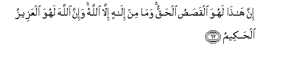 62. Inna hatha lahuwa alqasasu alhaqqu wama min ilahin illa Allahu wa-inna Allaha lahuwa alAAazeezu alhakeemu