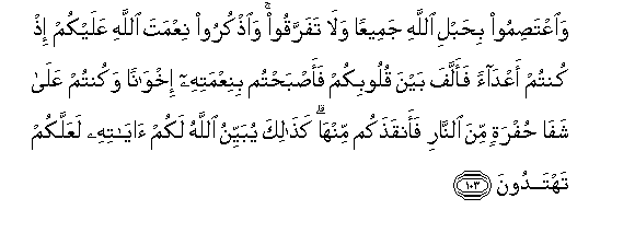 103. WaiAAtasimoo bihabli Allahi jameeAAan wala tafarraqoo waothkuroo niAAmata Allahi AAalaykum ith kuntum aAAdaan faallafa bayna quloobikum faasbahtum biniAAmatihi ikhwanan wakuntum AAala shafa hufratin mina alnnari faanqathakum minha kathalika yubayyinu Allahu lakum ayatihi laAAallakum tahtadoona