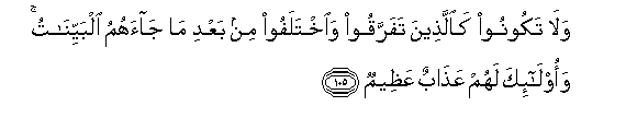 105. Wala takoonoo kaallatheena tafarraqoo waikhtalafoo min baAAdi ma jaahumu albayyinatu waola-ika lahum AAathabun AAatheemun