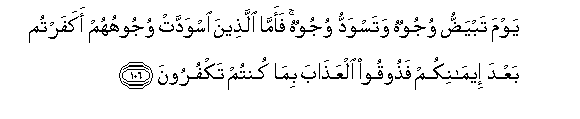 106. Yawma tabyaddu wujoohun wataswaddu wujoohun faamma allatheena iswaddat wujoohuhum akafartum baAAda eemanikum fathooqoo alAAathaba bima kuntum takfuroona
