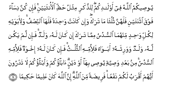 11. Yooseekumu Allahu fee awladikum lilththakari mithlu haththi alonthayayni fa-in kunna nisaan fawqa ithnatayni falahunna thulutha ma taraka wa-in kanat wahidatan falaha alnnisfu wali-abawayhi likulli wahidin minhuma alssudusu mimma taraka in kana lahu waladun fa-in lam yakun lahu waladun wawarithahu abawahu fali-ommihi alththuluthu fa-in kana lahu ikhwatun fali-ommihi alssudusu min baAAdi wasiyyatin yoosee biha aw daynin abaokum waabnaokum la tadroona ayyuhum aqrabu lakum nafAAan fareedatan mina Allahi inna Allaha kana AAaleeman hakeeman