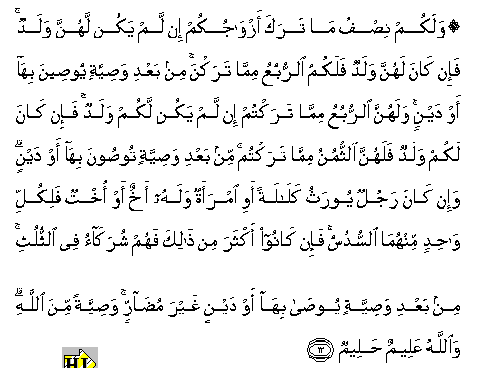 12. Walakum nisfu ma taraka azwajukum in lam yakun lahunna waladun fa-in kana lahunna waladun falakumu alrrubuAAu mimma tarakna min baAAdi wasiyyatin yooseena biha aw daynin walahunna alrrubuAAu mimma taraktum in lam yakun lakum waladun fa-in kana lakum waladun falahunna alththumunu mimma taraktum min baAAdi wasiyyatin toosoona biha aw daynin wa-in kana rajulun yoorathu kalalatan awi imraatun walahu akhun aw okhtun falikulli wahidin minhuma alssudusu fa-in kanoo akthara min thalika fahum shurakao fee alththuluthi min baAAdi wasiyyatin yoosa biha aw daynin ghayra mudarrin wasiyyatan mina Allahi waAllahu AAaleemun haleemun