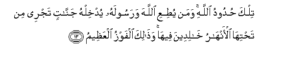 13. Tilka hudoodu Allahi waman yutiAAi Allaha warasoolahu yudkhilhu jannatin tajree min tahtiha al-anharu khalideena feeha wathalika alfawzu alAAatheemu