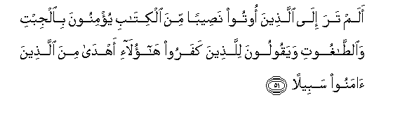 51. Alam tara ila allatheena ootoo naseeban mina alkitabi yu/minoona bialjibti waalttaghooti wayaqooloona lillatheena kafaroo haola-i ahda mina allatheena amanoo sabeelan