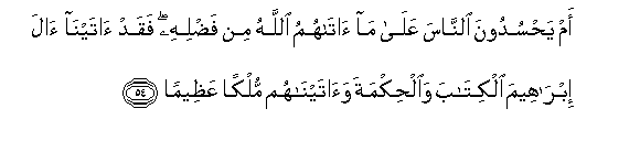 54. Am yahsudoona alnnasa AAala ma atahumu Allahu min fadlihi faqad atayna ala ibraheema alkitaba waalhikmata waataynahum mulkan AAatheeman