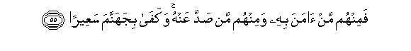 55. Faminhum man amana bihi waminhum man sadda AAanhu wakafa bijahannama saAAeeran