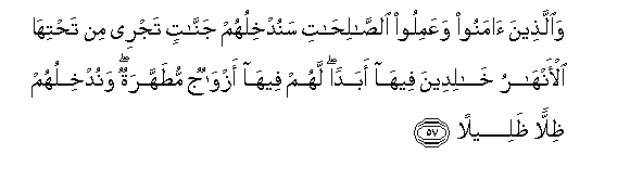 57. Waallatheena amanoo waAAamiloo alssalihati sanudkhiluhum jannatin tajree min tahtiha al-anharu khalideena feeha abadan lahum feeha azwajun mutahharatun wanudkhiluhum thillan thaleelan