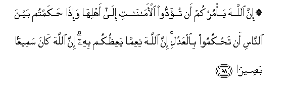 58. Inna Allaha ya/murukum an tu-addoo al-amanati ila ahliha wa-itha hakamtum bayna alnnasi an tahkumoo bialAAadli inna Allaha niAAimma yaAAithukum bihi inna Allaha kana sameeAAan baseeran