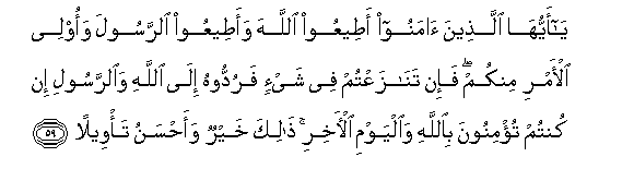 59. Ya ayyuha allatheena amanoo ateeAAoo Allaha waateeAAoo alrrasoola waolee al-amri minkum fa-in tanazaAAtum fee shay-in faruddoohu ila Allahi waalrrasooli in kuntum tu/minoona biAllahi waalyawmi al-akhiri thalika khayrun waahsanu ta/weelan