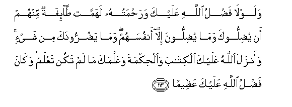 113. Walawla fadlu Allahi AAalayka warahmatuhu lahammat ta-ifatun minhum an yudillooka wama yudilloona illa anfusahum wama yadurroonaka min shay-in waanzala Allahu AAalayka alkitaba waalhikmata waAAallamaka ma lam takun taAAlamu wakana fadlu Allahi AAalayka AAatheeman