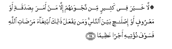 114. La khayra fee katheerin min najwahum illa man amara bisadaqatin aw maAAroofin aw islahin bayna alnnasi waman yafAAal thalika ibtighaa mardati Allahi fasawfa nu/teehi ajran AAatheeman
