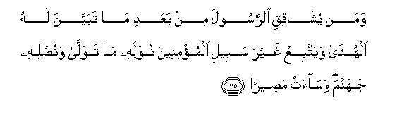 115. Waman yushaqiqi alrrasoola min baAAdi ma tabayyana lahu alhuda wayattabiAA ghayra sabeeli almu/mineena nuwallihi ma tawalla wanuslihi jahannama wasaat maseeran
