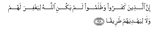168. Inna allatheena kafaroo wathalamoo lam yakuni Allahu liyaghfira lahum wala liyahdiyahum tareeqan