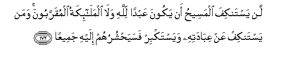 172. Lan yastankifa almaseehu an yakoona AAabdan lillahi wala almala-ikatu almuqarraboona waman yastankif AAan AAibadatihi wayastakbir fasayahshuruhum ilayhi jameeAAan